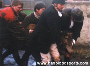 The Ward Union drag an injured, exhausted deer through a yard at the end of a hunt. Photo: Philip Kiernan