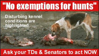 Please join the Irish Council Against Blood Sports in urging TDs and Senators to act to ensure that hunting groups are not afforded an exemption under the Dog Breeding Establishments Bill 2009. In our appeal to politicians, ICABS highlighted the appalling conditions in hunt kennels and the destruction by hunts of healthy hounds that are considered not good enough for hunting. Presenting politicians with photos of disturbing conditions in Irish hunt kennels, we asked for them to disregard claims made during recent debates that hunts have high standards of care for their dogs. "This claim is not based on the facts, particularly when you take into account the hunt practice of destroying hounds that are considered unsuitable for hunting or no longer fit for hunting," we stated. "These would NOT be old, unhealthy hounds but hounds that are simply not considered satisfactory as regards speed or ability to follow scent." We also directed their attention to an article in Animal Voice which highlights the appalling attitude of those in charge of hunt kennels. The article told of how a caller who enquired about adopting a hunt hound was told that the kennels don't rehome dogs because they are killed instead. TDs and Senators were also reminded that the hunting hounds in question are used for the most horrendous cruelty to Irish animals. They chase wildlife across the countryside, catch them and rip their bodies asunder, we pointed out. "We urge you to please support the inclusion of hunts in this bill and take this opportunity to introduce a financial disincentive for the breeding of these killer dogs," we stated in our appeal. "This would be widely welcomed by the compassionate majority as a step towards a long overdue ban on hunting and an end to the associated animal cruelty."