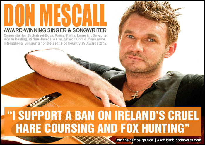 A big thank you to celebrated singer/songwriter Don Mescall for expressing his support for a ban on bloodsports in Ireland. "I support a ban on Ireland's cruel hare coursing and foxhunting," the award-winning musician has stated.